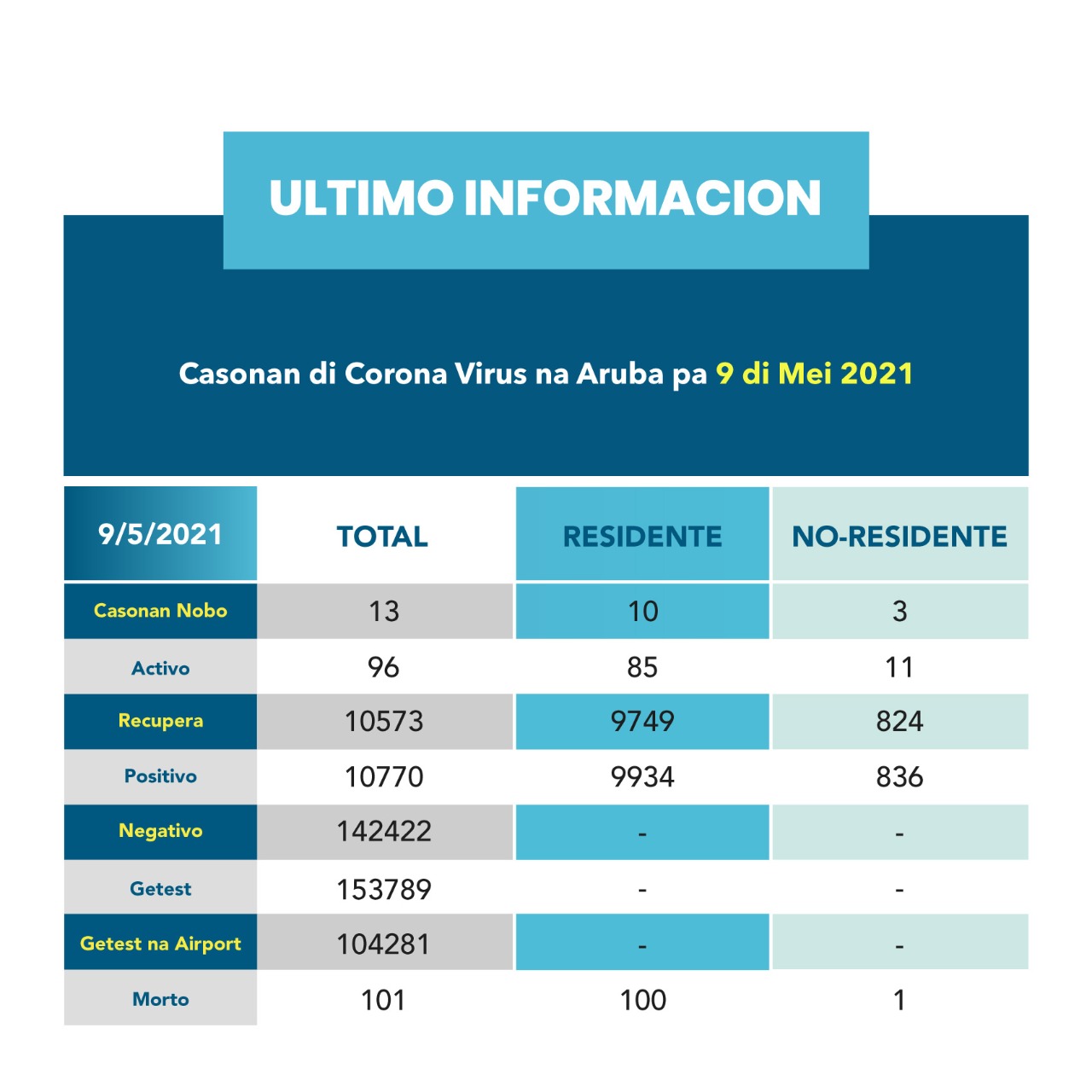 ORANJESTAD, 09 mei 2021. Segun resumen di awe 9 persona a recupera, a registra un total di 13 caso nobo di Covid-19, di cual 3 ta no-residente. E cantidad total di testnan ehecuta ayera na e diferente localidadnan na Aruba, entre otro laboratorio di hospital, laboratorionan priva y aeropuerto ta 674 test. ‘Positivity rate’ entre nos residentenan ta 13 %.