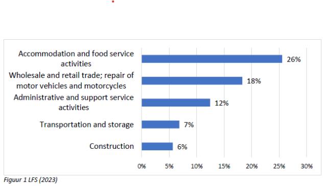 Nos sector di hotel y restaurant (accommodation and food services), cu ta e sector mas grandi di empleo na Aruba, ta duna rond 10% di nos hobennan empleo. Den e siguiente ilustracion por mira cu un parti grandi (20%) di e hobennan di 15 – 24 aña ta labora den e grupo di funcion: ‘service and sales workers’.