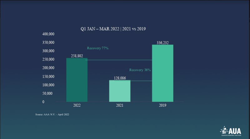 ORANJESTAD – Aruba Airport Authority N.V. (AAA) can report as follows on AUA Airport’s performance for the 1st quarter of 2022; like 2021, it was a slow start, however with a satisfying recovery rate versus the same period in 2019. The total amount of revenue generating passengers (departing passengers) handled in the 1st quarter of 2022 during January, February and March represented a total recovery of 77% versus 2019.