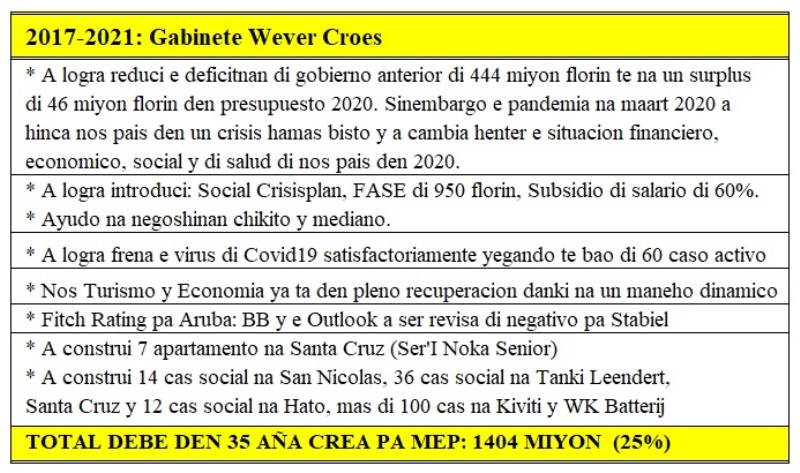 E siguiente gobernacion, Gabinete Wever Croes a hereda un caha completamente bashi, pero den un tempo record a cuminsa rescata e finansas di pais Aruba y tambe a cuminsa traha urgentemente riba e Crisis Plan Social. Te hasta pa presupuesto 2020 a yega na un surplus di 46 miyon florin, pero e pandemia mundial na maart 2020 a hinca nos pais den problemanan serio, tanto riba tereno di finansa, economia, salud, empleo, social etc. Asina mes Gabinete Wever Croes a logra pa tur esnan cu a ser afecta pa e pandemia, ricibi Fase, Subsidio di salario y tambe a brinda ayudo na companianan chikito y mediano. Awe nos pais poco poco ta recuperando di e pandemia danki na e maneho responsabel hiba pa frena Covid19. Por sinti caba con nos turismo ta creciendo den forma constante, mas empleo ta ser crea y mas negoshi ta inscribi na KvK. Sin duda cu durante e 4 añanan di Gabinete Wever Croes hopi enfasis a ser poni riba Integridad, Honestidad y Calidad halto di gobernacion. Esaki ta marca e diferencia grandi cu AVP cu ta simbolo di Corupcion y Malgobernacion.