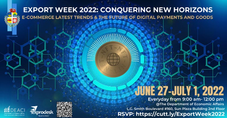 Export Week 2022 ta organisa pa tur entrepreneur y comerciante local.  Durante e Export Week, participantenan lo ricibi informacion tocante ‘E-commerce latest trends’, pagonan digital, logistica, ‘blockchain’, ‘cryptocurrencies’, ‘crypto wallets’ y ‘non-fungible token (NFT)’. E siman lo inicia cu informacion tocante di e parti mas tradicional cu ta E-commerce, ‘digital marketing’, ‘content creation’ y ‘public relations’. Despues lo trata topiconan tambe manera ‘ePayments- Multi-Channel Payment Processing’, ‘circular economy’, ‘doing business with the USA, Asia and the Caribbean’, ‘the future of digital payments’, ‘loyalty programs with crypto based possibility’, ‘digital goods/NFTs’. Finalmente e siman lo termina cu un tayer na unda tur participante ta haya e oportunidad unico di por bin cu nan laptop y crea nan propio ‘wallet’, bay cas cu ‘cryptocurrency’ y crea ademas nan mesun ‘non-fungible token (NFT)’.