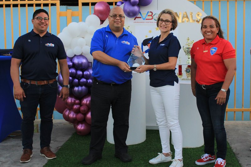 Sra. Gina Habibe, Executive Director di Aruba Bank a ricibi un obsekio for di Presidente di AVB, sr. Randolf Lacle, como aprecio pa e confianza y sosten duna na e deporte di futbol di damas.