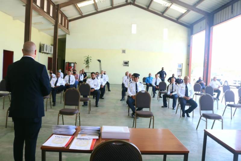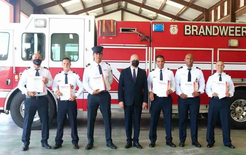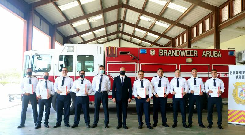 Minister Andin Bikker a otorga certificado y reconocimento na miembronan di Cuerpo di Bombero. Ta trata aki di 22 bombero cu a haya nan diploma di Brandweerkorps Manschap A y B. Tambe 11 adspirant cu a wordo tuma den servicio a ricibi nan diploma A. Di otro banda tin un grupo preparando pa start e curso di “vakmanschap C”.