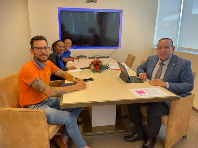 ORANJESTAD: Recientemente, Minister di Enseñansa y Deporte Endy Croes a reuni cu e presidente Sr. Andre Angela di Arubaanse Atletiek Bond y e miembronan di directiva Sra. Safiera Schippers y Sra. Anecy Toussaint. Durante e reunion, a pidi informacion di e avancenan di e atletiekbaan di e proyecto di renobacion di Compleho Deportivo Guillermo Prospero Trinidad na Dakota. Minister Endy Croes a indica cu si e proyecto cana segun planificacion, e trabou di renobacion lo ta finalisa pa maart binidero. Pues, desde april en adelante Arubaanse Atletiek Bond por inicia cu nan planificacion pa training of eventonan deportivo riba e atletiekbaan nobo na Compleho Deportivo Guillermo Prospero Trinidad. Ademas, Sr. Angela a splica cu tin algun atleta cu mester bay cualifica nan tempo pa por participa den e campeonato di Caribbean Free Trade Association (CARIFTA). En bista cu actualmente Aruba no tin un pista di atletiek, e atletanan tin cu bay na Curaçao e luna aki pa cualifica nan tempo, den cual e mandatario di Deporte a duna aporte pa cumpra nan pasashi. Fuera di esaki, Sr. Angela a indica cu e dak di e lokaal na stadion cu ta uza pa timing system no ta den bon condicion. Minister Endy Croes a garantisa cu esaki tambe lo ta renoba momento cu finalisa e renobacion di e stadion. Tambe, nan a indica cu e timing system cu nan ta uza ta hopi bieu y Minister Endy Croes a pidi nan pa busca conseho na World Athletics pa evalua ki tipo di timing system por haya mas moderno y asina Ministerio di Deporte por duna un contribucion tambe pa esaki.