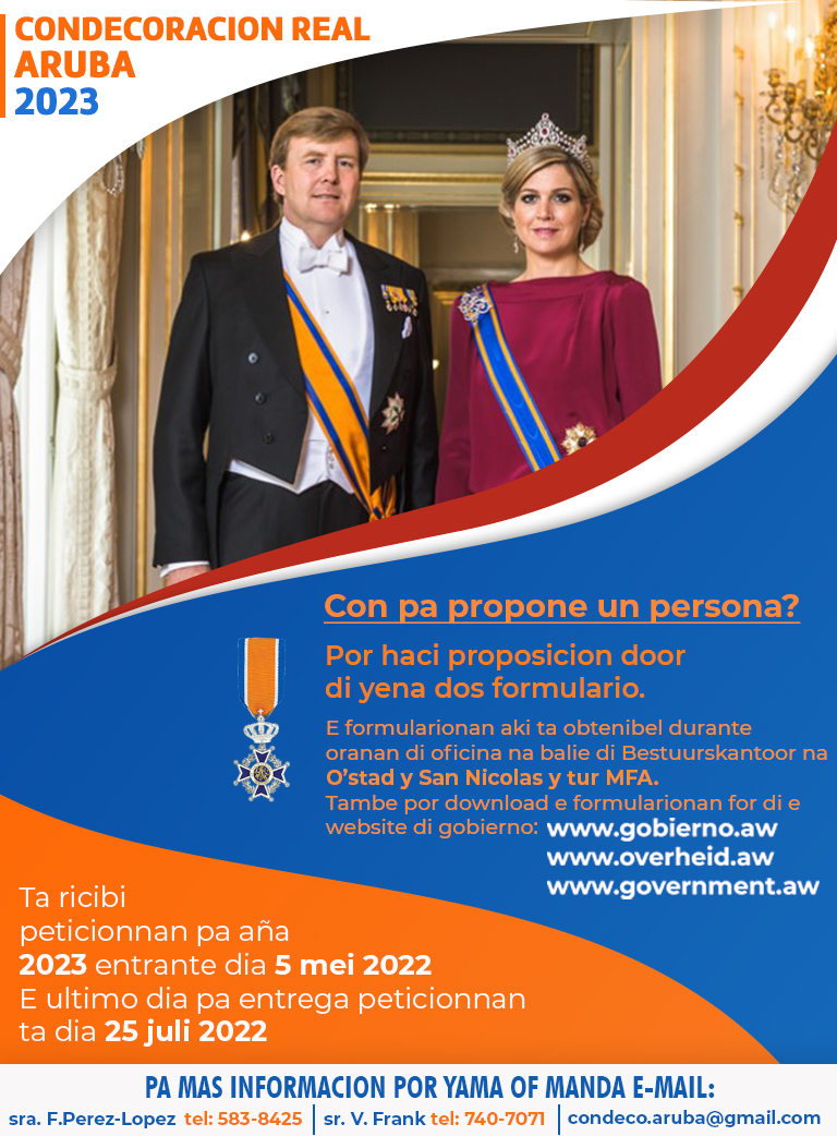 ORANJESTAD- Cada aña Gobernador di Aruba, Su Excelencia Señor Alfonso Boekhoudt, ta otorga e Condecoracion Real na varios ciudadano di Aruba cu a haci un tarea excepcional banda di nan trabou normal. Entre otro, trabou boluntario, trabou riba tereno di deporte, asistencia social y mas. Prome Minister Evelyn Wever – Croes ta anuncia cu aworaki tin e oportunidad pa nombra un persona pa ricibi e condecoracion na luna di April 2023, e deadline pa haci esaki ta 25 di juli.