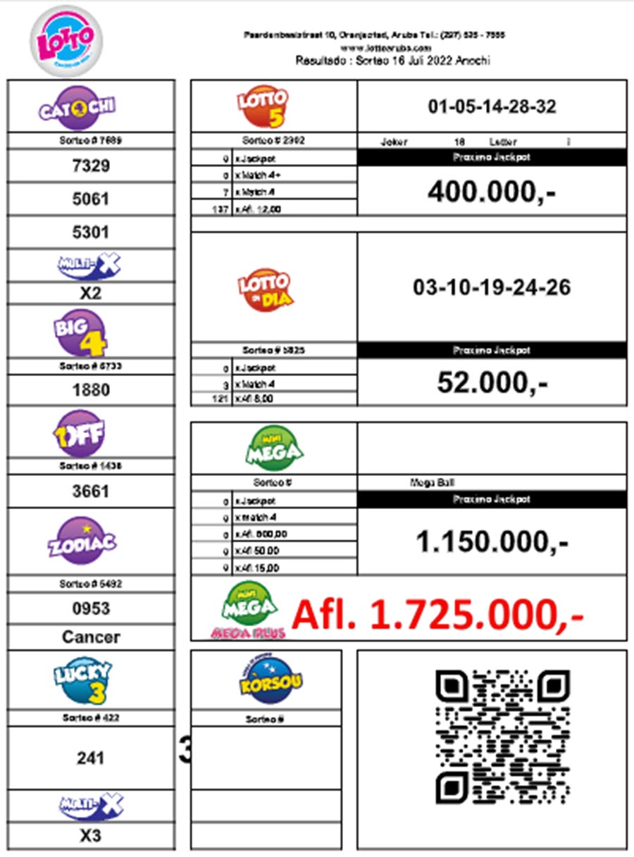 LottoResultado di sorteo 16 Jul 2022 Anochi by Admin July 17, 2022 July 17, 2022 0 comments 284 views284 Share 0 FacebookTwitterLinkedinWhatsappTelegramEmail previous post Aurora/Royal/ Pray Funeral Home cu Gradicimento y invitacion di Sonia P. Tromp next post Prome Minister Evelyn Wever-Croes: Secretario di Estado Alexandra Van Huffelen: ARUBA MESTER PERCURA PA AUMENTA E PESO DI IMPUESTO! You may also like Luna di Locura cu Lotto 5 Carnaval Edition! September 29, 2025 Aruba a conoce e di tercer miyonario pa 2025 cu Lotto! September 16, 2025 Awe abo por ta e siguiente miyonario di Aruba! September 5, 2025 Luna di Locura cu Lotto 5! Cu cada 2 Lotto 5 riba e mesun... August 29, 2025 Lotto ta introduci un miembro nobo di Instacash “Crazy Wild Cash”! August 28, 2025 Salida di wega di Instacash “Instant Jackpot 2”. August 27, 2025