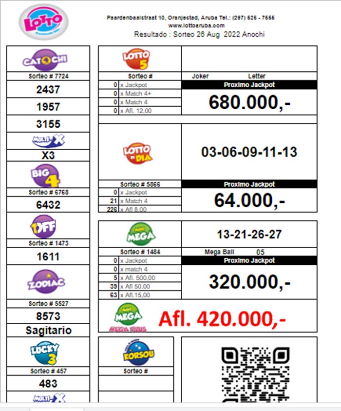 LottoResultado di Sorteo di Lotto di 26 augustus 2022 Anochi by Admin August 28, 2022 August 28, 2022 0 comments 342 views342 Share 0 FacebookTwitterLinkedinWhatsappTelegramEmail previous post Den Hot Zone: Party bus completo controla door di polis, tur hende a wordo rista next post ATIA a organisa un exitoso LIDERA Conference cu oradornan di renombre You may also like Luna di Locura cu Lotto 5 Carnaval Edition! September 29, 2025 Aruba a conoce e di tercer miyonario pa 2025 cu Lotto! September 16, 2025 Awe abo por ta e siguiente miyonario di Aruba! September 5, 2025 Luna di Locura cu Lotto 5! Cu cada 2 Lotto 5 riba e mesun... August 29, 2025 Lotto ta introduci un miembro nobo di Instacash “Crazy Wild Cash”! August 28, 2025 Salida di wega di Instacash “Instant Jackpot 2”. August 27, 2025