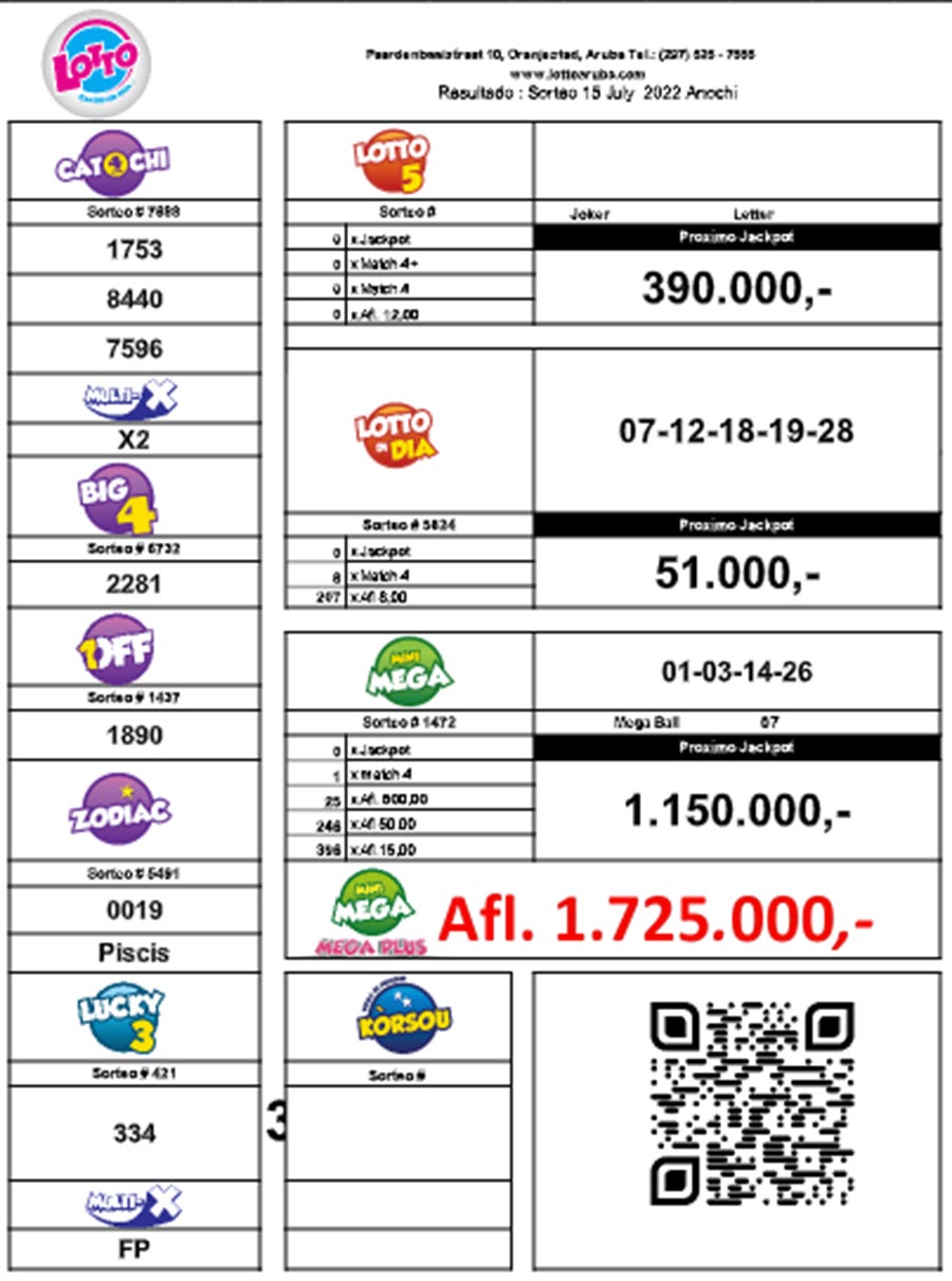 LottoResultado : Sorteo 15 July 2022 Anochi by Admin July 16, 2022 July 16, 2022 0 comments 286 views286 Share 0 FacebookTwitterLinkedinWhatsappTelegramEmail previous post Un di e maneranan pa drent’e Aruba: Boto local haya cu droga, dos persona deteni next post Resultado di sorteo 16 Jul 2022 Merdia You may also like Luna di Locura cu Lotto 5 Carnaval Edition! September 29, 2025 Aruba a conoce e di tercer miyonario pa 2025 cu Lotto! September 16, 2025 Awe abo por ta e siguiente miyonario di Aruba! September 5, 2025 Luna di Locura cu Lotto 5! Cu cada 2 Lotto 5 riba e mesun... August 29, 2025 Lotto ta introduci un miembro nobo di Instacash “Crazy Wild Cash”! August 28, 2025 Salida di wega di Instacash “Instant Jackpot 2”. August 27, 2025